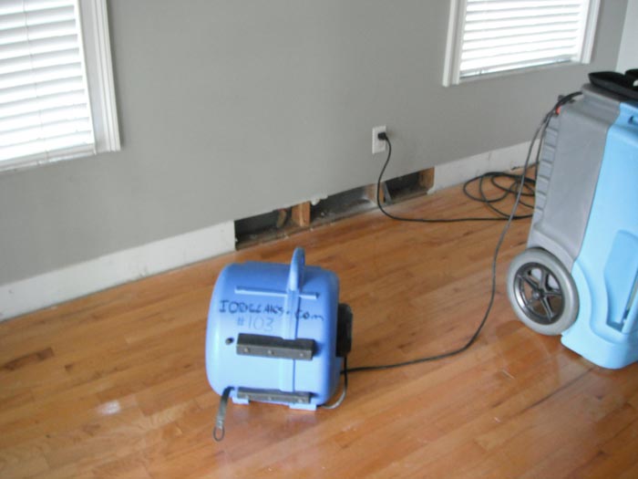 As you can see in the pictures, we were able to dry the walls by simply removing the baseboards. We are very careful with our work in order to cause as least amount of damage to the property after water damage occurs. We have seen numerous water damage contractors open holes in walls in order to dry them by using hammers. We use special tools that cut straight lines in water damaged building materials in order to save walls and especially painted walls. It can be very difficult to match walls that were painted previously. Water leaks can be frustrating, and the water damage caused by them can be even more frustrating. Call a licensed contractor that cares about you and your property. If you suspect water leaks or water damage in your home or commercial property, take care of it as soon as possible or mold growth can and will occur rapidly.