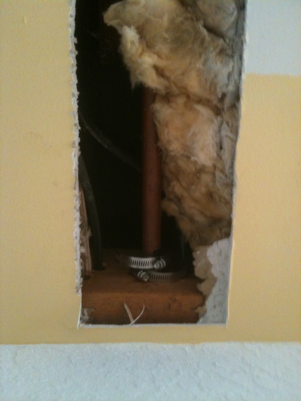 Plumbing Pipe Leak Brandon. A Brandon homeowner contacted I Find Leaks in regards to a plumbing pipe leak in their Brandon home. Plumbing pipe leaks can happen at any time and usually occur without warning. Plumbing pipe leaks can be tricky to find without the right equipment. I Find Leaks has invested thousands of dollars into state of the art water leak detection equipment. With our infrared leak detection equipment we have been able to successfully locate hundreds of leaks inside of Brandon Florida homes and businesses. We also have proprietary methods for finding leaks underneath floors and concrete slabs as well as outside of Brandon properties. If water leaks are not located and resolved quickly, water damage, black mold and mold growth can and will occur. As you can see in the pictures below, this water leak was on a copper plumbing line that was located in a wall of this Brandon home.