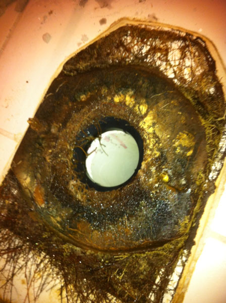 A South Tampa homeowner contacted I Find and Dry Leaks in regards to a Tampa water leak and water damage issue. The closet behind one of the bathrooms in their Victorian home became damp and they could not figure out where the source of the water leak was coming from. The team at I Find Leaks uses state of the art infrared water leak detection equipment and ultrasonic water leak detection equipment in order to solve your water leak issues. I Find Leaks has been solving water leak related issues in the Tampa and South Tampa areas for years. As you can see in the pictures below, this water leak was caused by a sewer line and not a pressurized plumbing leak. Roots had grown up around the sewer line which caused a breach of the wax seal that keeps waste water from leaking around the base of the toilet when the toilet is flushed. In this case, a small amount of water leaked out of the base of the toilet every time the toilet was flushed.