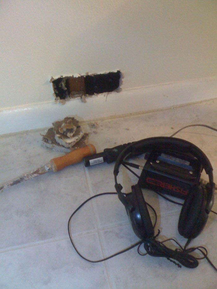 A Clearwater Beach homeowner called us in regards to a water leak which was causing water damage to a wall in their home. This Clearwater Beach homeowner found water along one of the baseboards in their dining room. After continuously using a shop vac to suck up the water, it kept reappearing. Water that returns after it is dried or sucked up, can be the signs of a water leak. Leaking water can be the start of a possible mold growth problem. With the high humidity here in Florida, once mold starts growing in walls or ceilings in can rapidly accelerate. We use infrared leak inspection equipment along with ultrasonic leak detection equipment to locate water leaks with minimal damage to your Tampa Bay area home or business. As you can see in the pictures below, we were able to locate this water leak in a wall in their dining room. A very small hole was needed in the wall in order to have a licensed plumber make the necessary plumbing pipe repair.