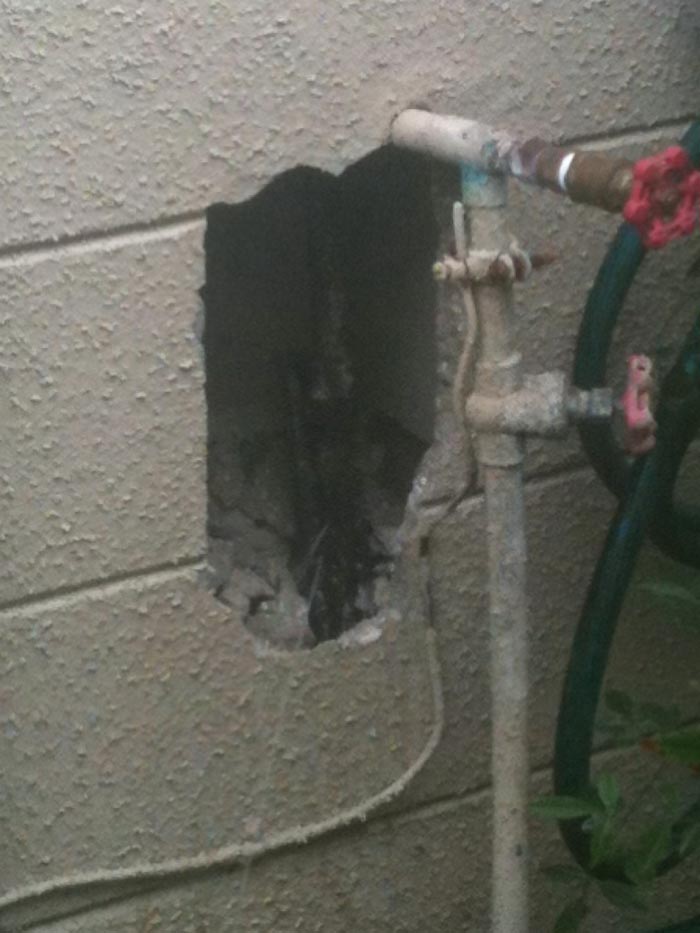 A Tampa homeowner contacted I Find Leaks in regards to a water leak that ended up being located in an exterior wall. The leaking plumbing pipe was causing water to show up on the floor inside of the master bathroom of the property. The main plumbing service pipe entered the house in a concrete block wall which was adjacent to the master bathroom. The Tampa homeowner thought the leaking pipe was underneath the concrete slab floor and was very pleased that the water leak ended up being in a wall where it was easily accessible for repair. In order to fix slab leaks, the floor must be jackhammered which causes a great deal of dust and destruction to the inside of Clearwater and Tampa properties. As you can see in the pictures below, we located the plumbing pipe leak and opened the concrete block wall to expose the Tampa pipe leak. Water pipe leaks must be found and water damage services rendered soon after water shows inside of the property. If water damage services are not rendered properly, mold growth can occur very quickly. Mold removal services are much more intensive to Tampa Bay area properties than leak detection and water damage restoration services.