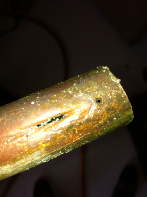 A Palma Ceia homeonwer contacted I Find Leaks in regards to a very high Palma Ceia water bill. After checking their toilets, water softener and sprinkler system for normal use, they determined the water useage showing on their water bill was coming from somewhere. Water leaks can underneath concrete slabs are known as slab leaks. Slab leaks can occur with no signs of water or water damage showing inside of Palma Ceia homes. The only clue may be a high water bill. The plumbing pipe leaks underneath homes are not obvious and special equipment must be used in order to locate them and have them repaired causing the least amount of damage to your Palma Ceia home. The team at I Find Leaks uses state of the art water leak detection equipment including infrared water leak inspection tools and ultrasonic water leak detection machines. With our proprietary process we are able to pinpoint water leaks inches from where they may occur underneath your concrete slab. We also have the tools and expertise to find water leaks in walls, ceilings and even outside in your yard. Water leaks that are left unattended can lead to issues such as high water bills, mold and mildew, black mold and the need for Palma Ceia mold removal projects. As you can see in the pictures below, this Palma Ceia water leak was caused by a small pinhole in a coppper plumbing pipe that was over 20 years old.