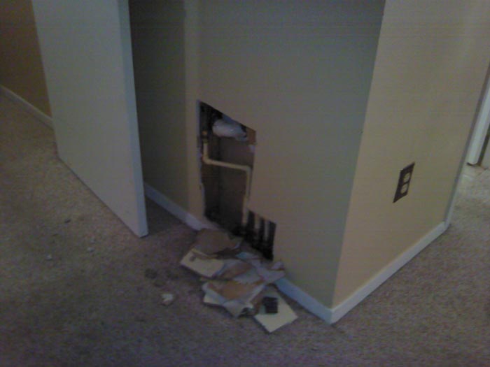 With our infrared leak detection equipment we are able to pinpoint the source of the water leak with the least amount of damage to your property. As you can see in the pictures below, this water leak was located on a water pipe inside of a wall. We only had to cut a hole in the drywall in the exact location of the water pipe leak. In addition to locating the water leak for this homeowner, we were also able to perform water damage restoration services in order to properly dry the property. When water damage occurs, if water damaged building materials aren’t dried properly the possibility for mold growth is very high. With the high humidity here in Florida, black mold growth can and will occur once water damage occurs.